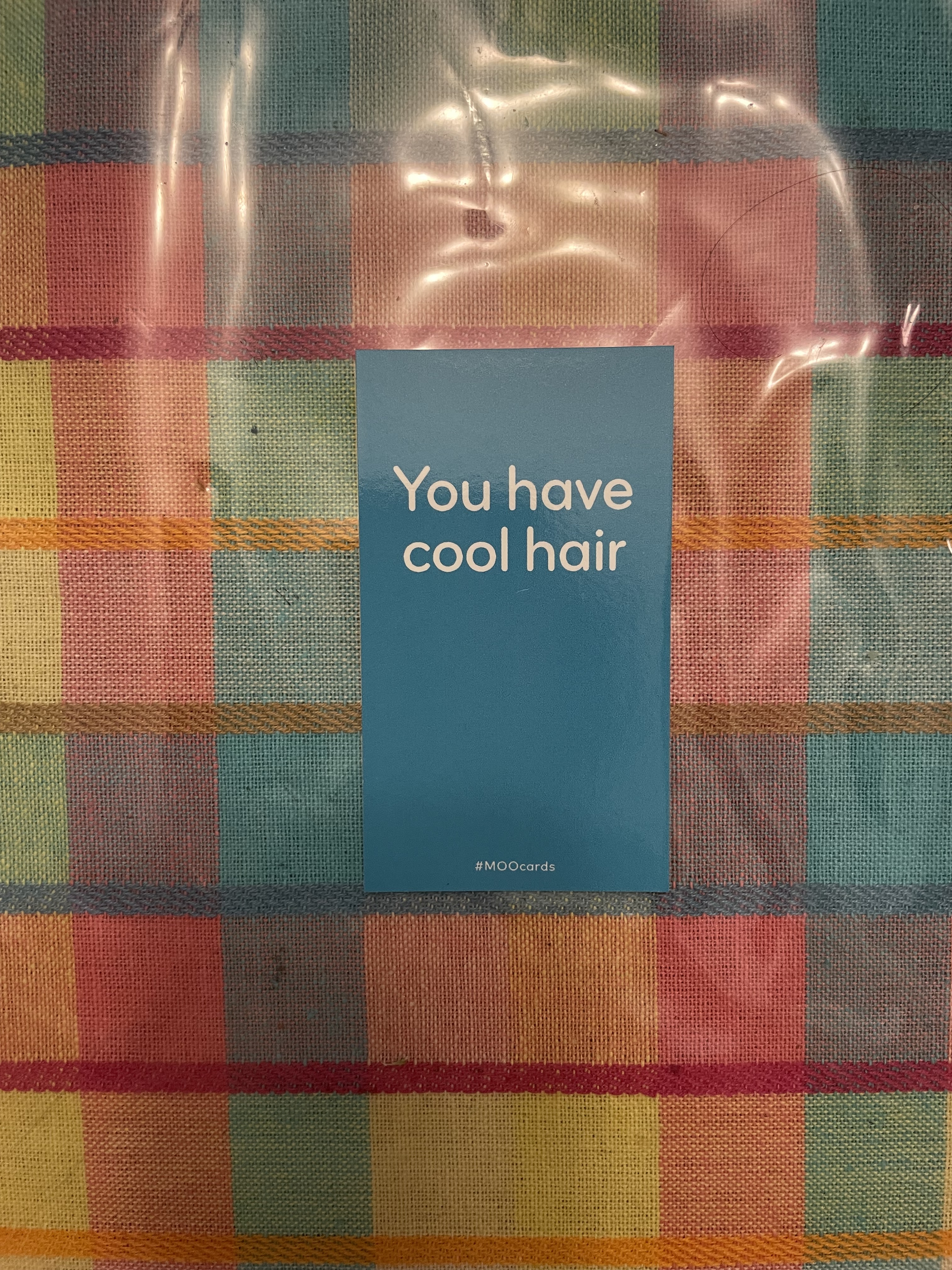 Mixed in with the business cards I found this blue card with white letters proclaiming: You have cool hair.